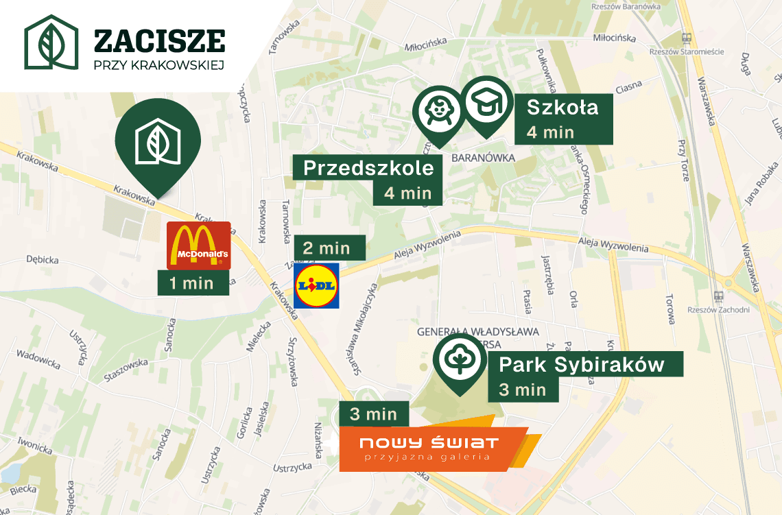 Nowe osiedle powstaje w spokojnej, a zarazem prężnie rozwijającej się północno-zachodniej części Rzeszowa. Wokół dominuje niska zabudowa i przyjazny, kameralny klimat. Zaledwie kilka minut dzieli Cię stąd od centrum oraz głównych tras – S19 i A4.