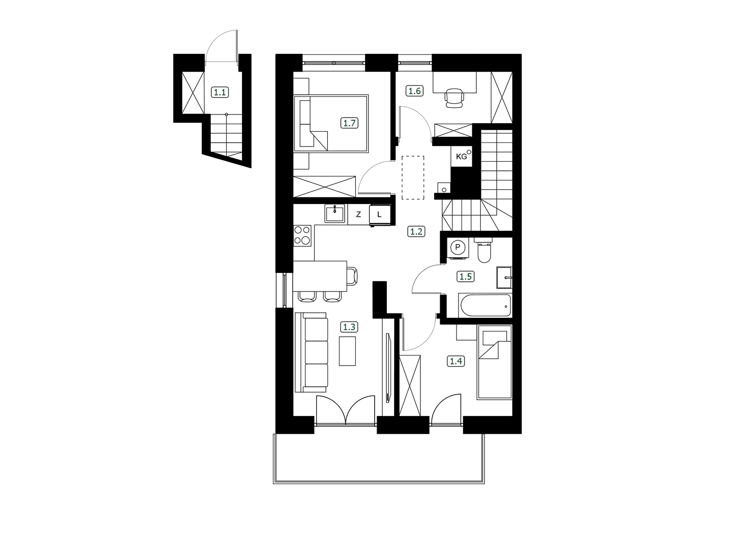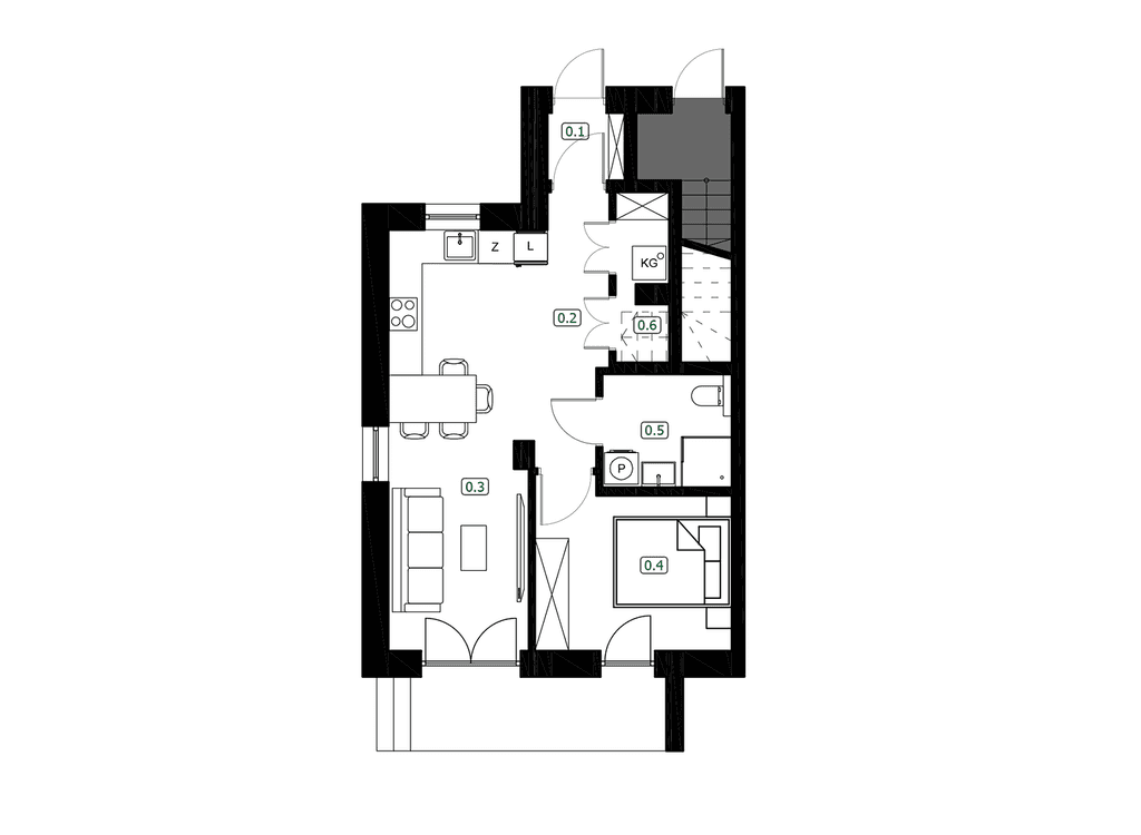 Na parterze znajdują się przytulne, dwupokojowe mieszkania z prywatnymi ogródkami, idealne dla par a na pierwszym piętrze zaprojektowano rodzinne, czteropokojowe z dodatkowym strychem z funkcją magazynową.